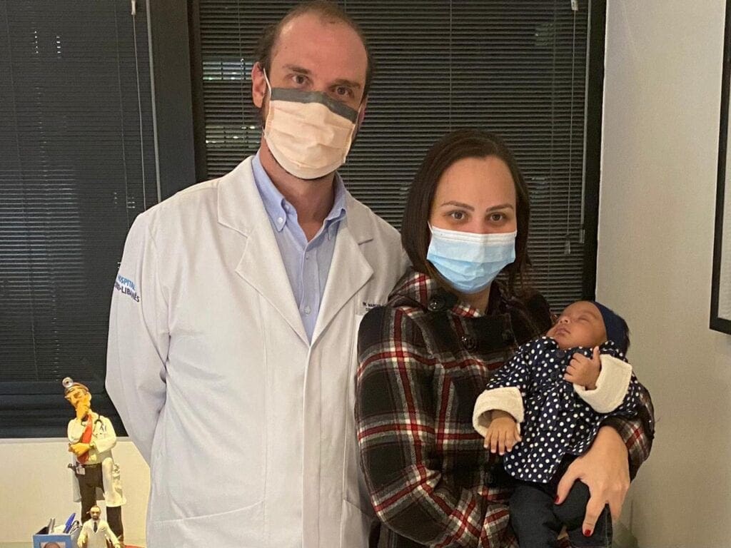 Camila com a filha e o médico Belotto em consulta de rotina após a cirurgia